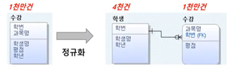 정규화 전 : 해당 학생이 수강 테이블에서 나타나는 수만큼 변경