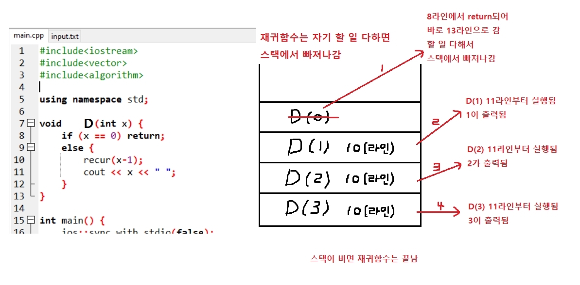 recur(x-1); 를 출력 뒤로 두면 3, 2, 1 순서로 출력된다.