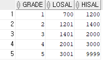 WHERE E.SAL BETWEEN LOSAL AND HISAL;