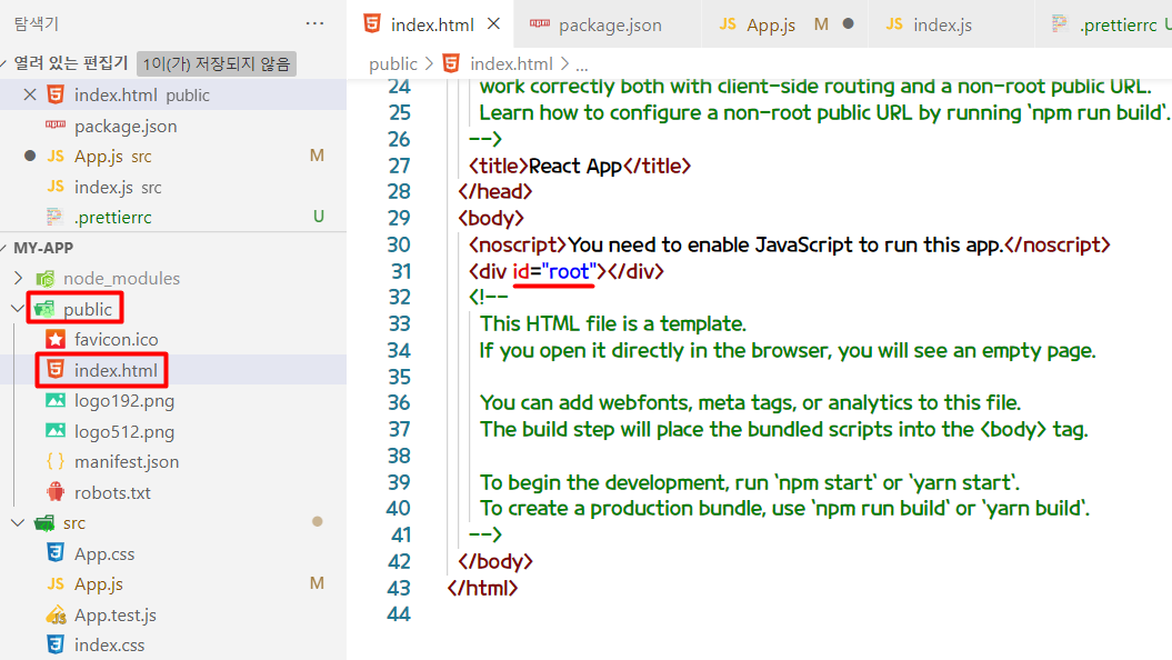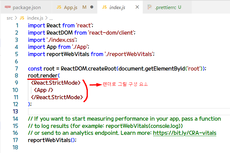 index.html에 있는 root 자리에 내가 만든 <App />을 그려준다는 것이다.