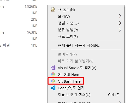 이 폴더 안에서 우클릭을 하고 Git Bash Here를 누른다.