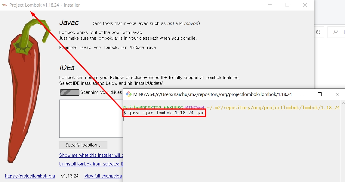 $ java -jar lombok-해당버전.jar 명령어를 치고 엔터키를 누르면