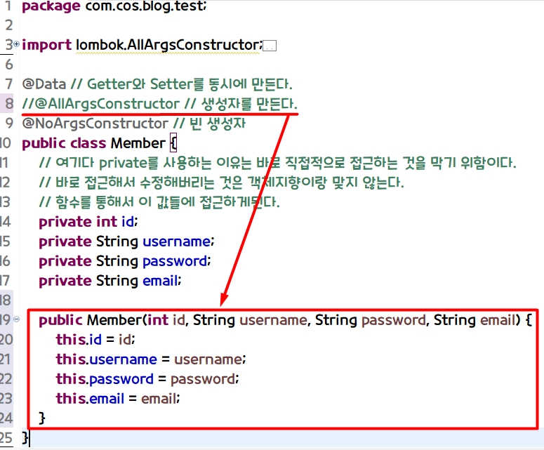 우선 @AllArgsConstructor 을 지우고 생성자를 직접 만들어보면,