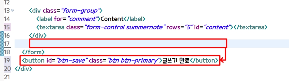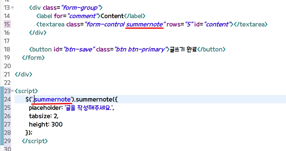 class에 summernote를 작성하고 다음처럼 코드를 수정해 입력한다.