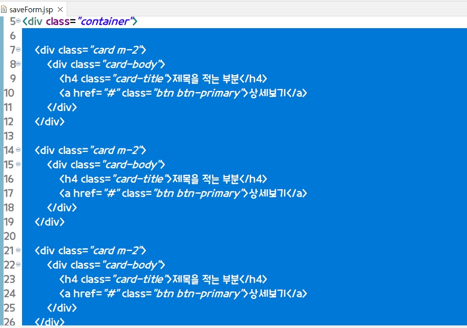 index.jsp를 복사해와서 saveForm.jsp가 이렇게 작성되어 있을텐데, 여기서 드래그한 컨테이너 안의 부분을 다 삭제하자
