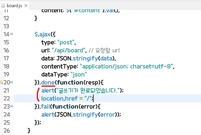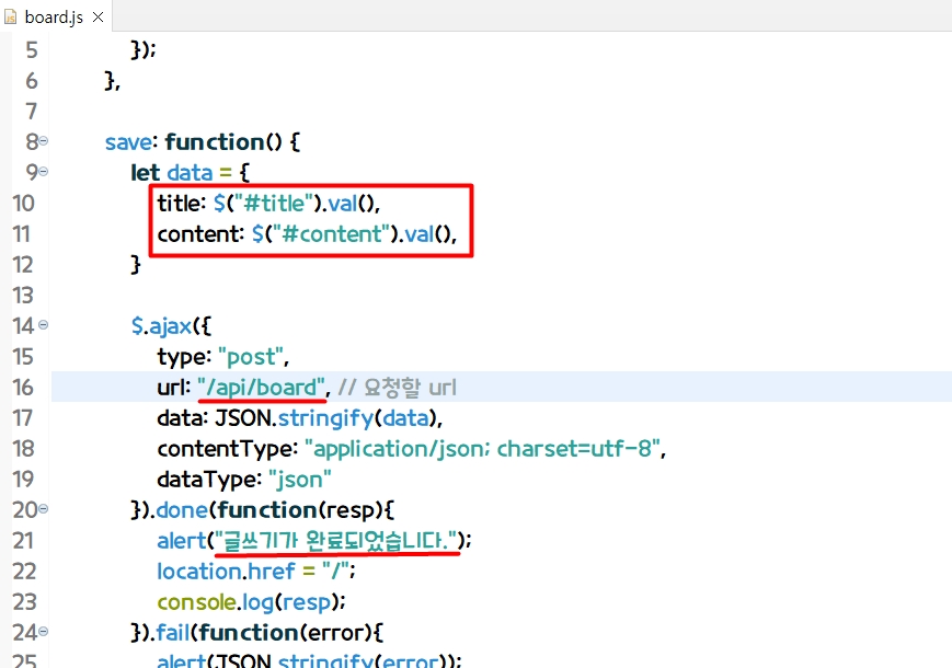 saveForm.jsp에서 글쓰기 완료 버튼을 누르면 title과 content를 /js/board.js로 들고간다.