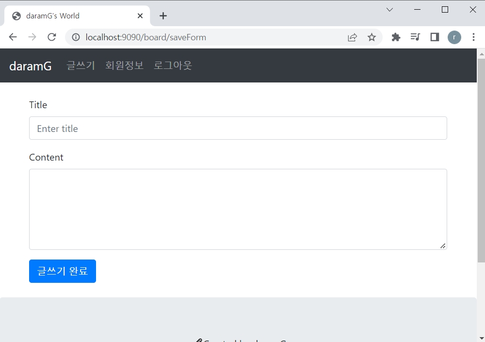 로그인 상태에서 글쓰기 버튼을 눌렀더니 saveForm.jsp가 제대로 적용된 모습이다.