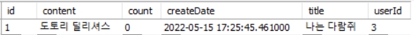 이 글 2개 모두 id가 3인 다람쥐가 쓴 글인데 board 테이블에 userId가 3이라고 잘 적혀있다.