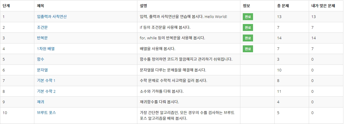 지금까지 4단계인 1차원 배열까지 문제를 풀고 학습해보았다.