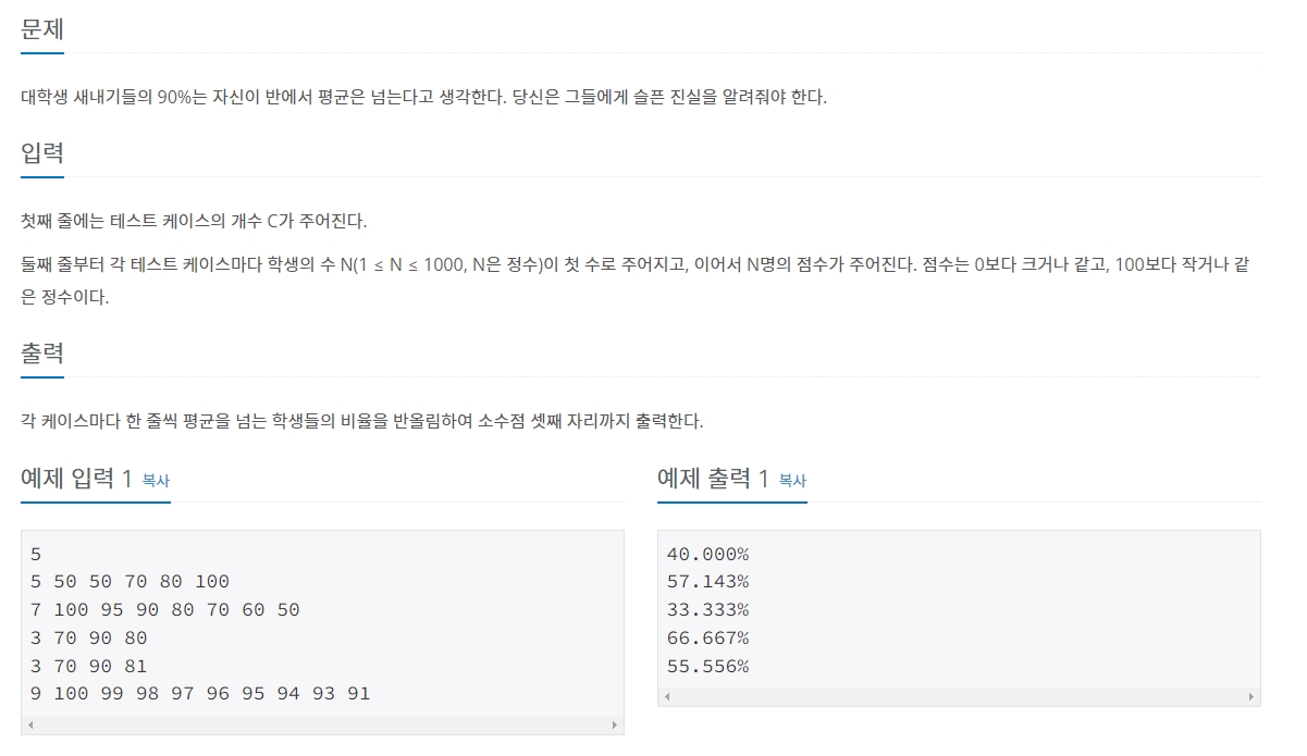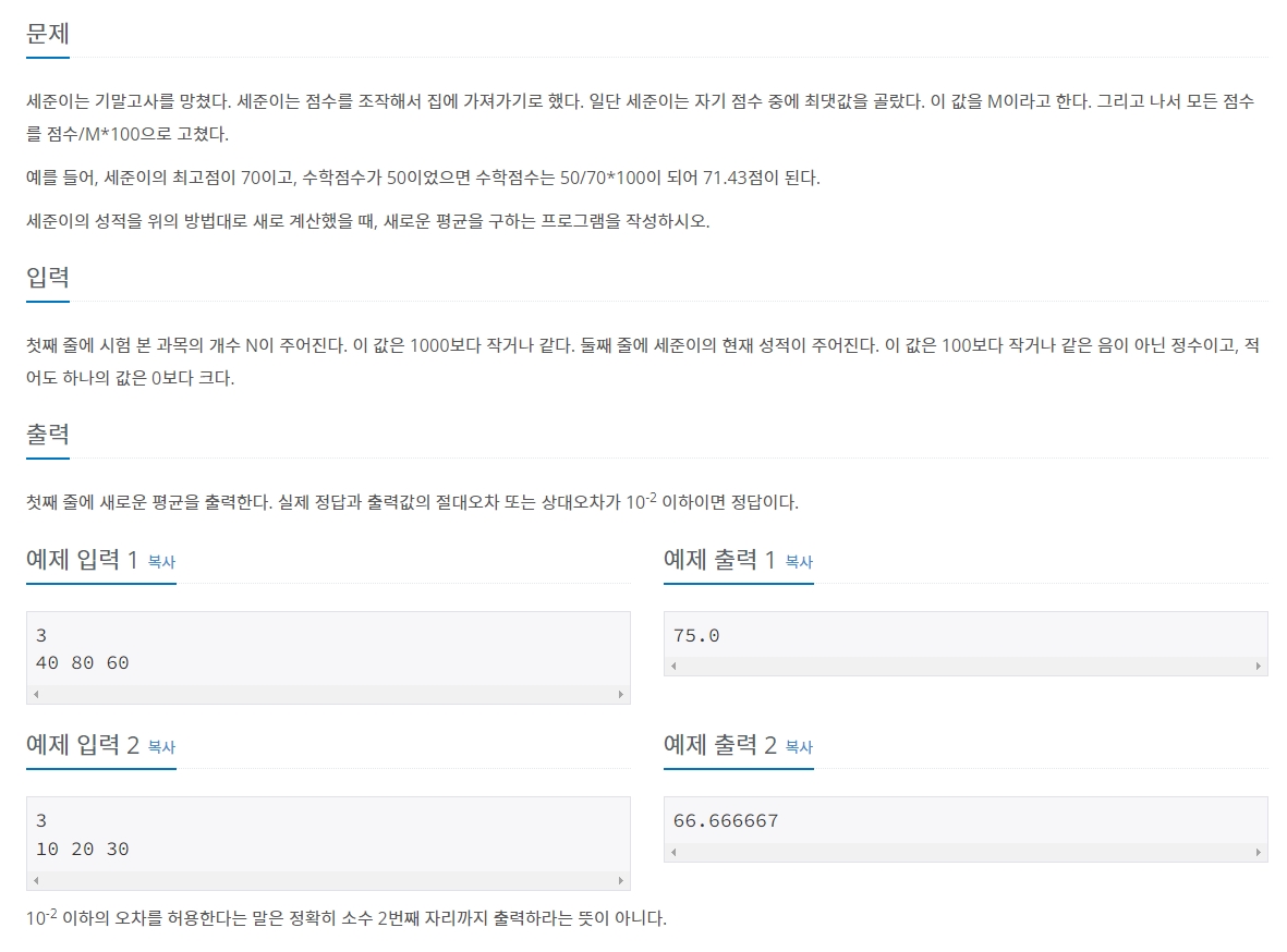 첫째 줄에 시험 본 과목의 개수 N이 주어진다. 이 값은 1000보다 작거나 같다. 둘째 줄에 세준이의 현재 성적이 주어진다. 이 값은 100보다 작거나 같은 음이 아닌 정수이고, 적어도 하나의 값은 0보