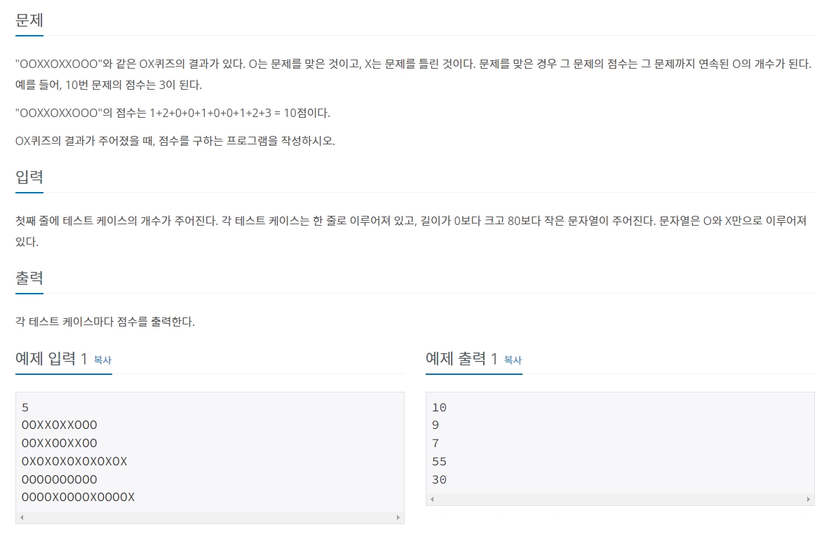 "OOXXOXXOOO"와 같은 OX퀴즈의 결과가 있다. O는 문제를 맞은 것이고, X는 문제를 틀린 것이다. 문제를 맞은 경우 그 문제의 점수는 그 문제까지 연속된 O의 개수가 된다. 예를 들어, 10번 문제의 점수