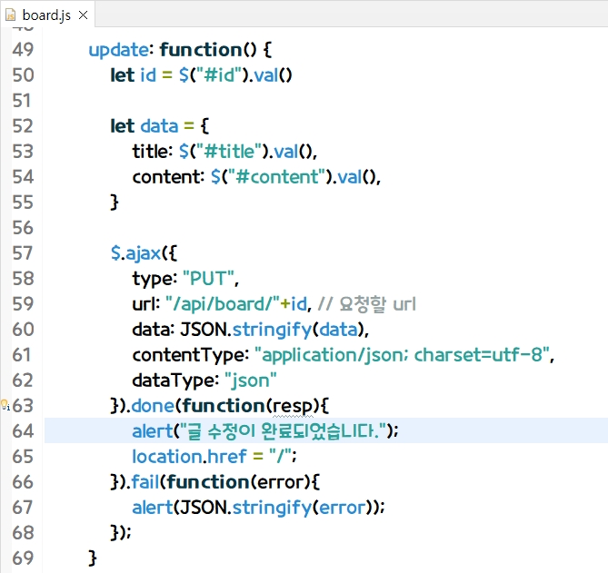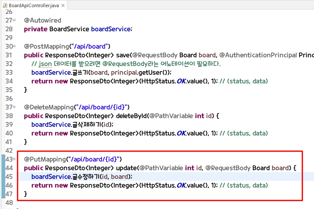 이제 BoardApiController로 가서 @PutMapping("/api/board")을 한 코드를 작성하면 된다.