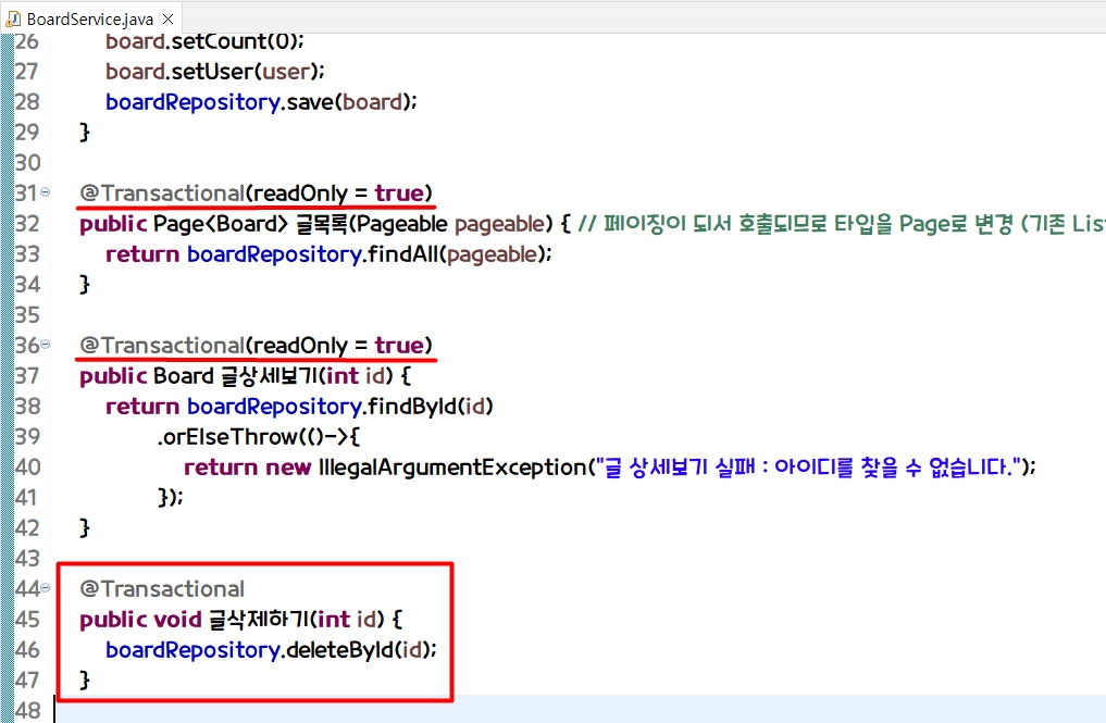 이제 boardService에서 삭제하기()를 만들어줘야 한다.