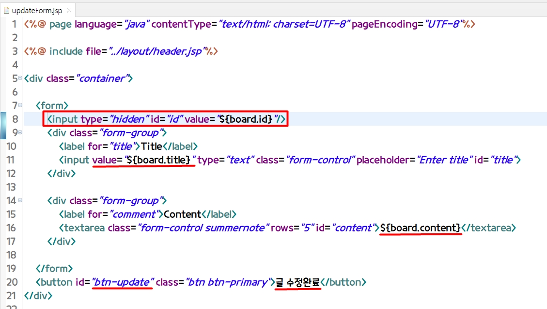 우선 board.id도 전달해야하니 숨겨진 입력 필드에다 제목과 내용에 그 board에 담겨있었던 title과 content를 주고